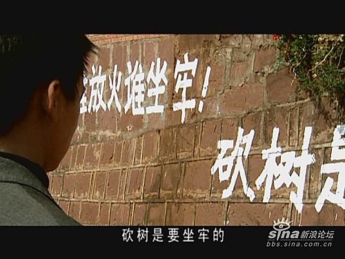 許三多看著剛剛寫到牆上的那些標語:砍樹是要坐牢的!