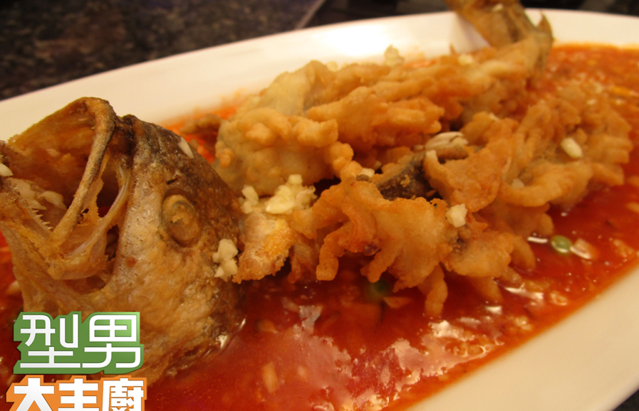 待油溫升高後,再次放入黃魚搶酥,取出吸油後入成品盤中排盤