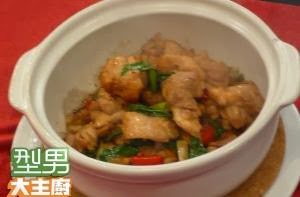 預熱砂鍋,倒入香油、麻油,爆香薑片、八顆蒜仁、辣椒段